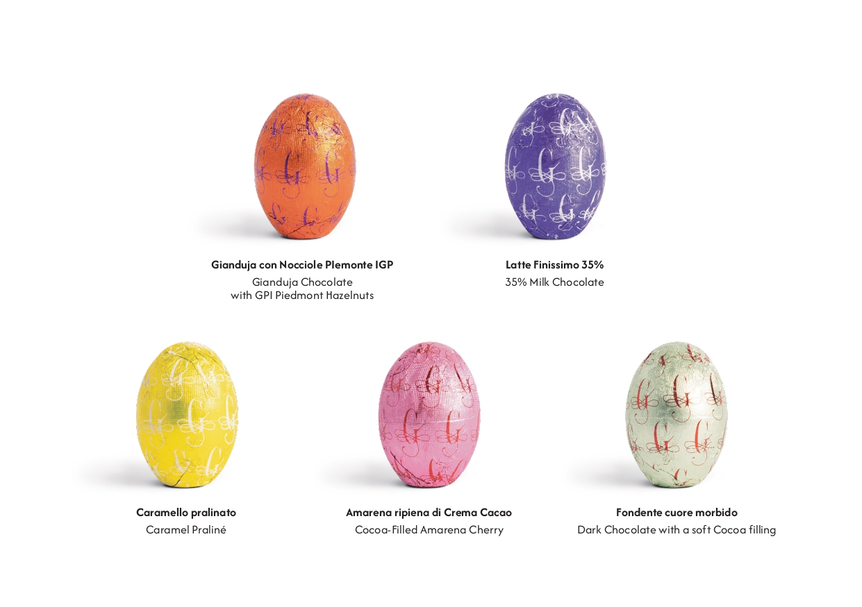 Ideal for tasting all 5 varieties. The Dark Chocolate flavor offers a new recipe with a soft cocoa center. The Gianduja egg is made with fine Piedmont IGP hazelnuts, milk from the Piedmontese Alpine supply chain, South American cocoa, and Italian sugar.