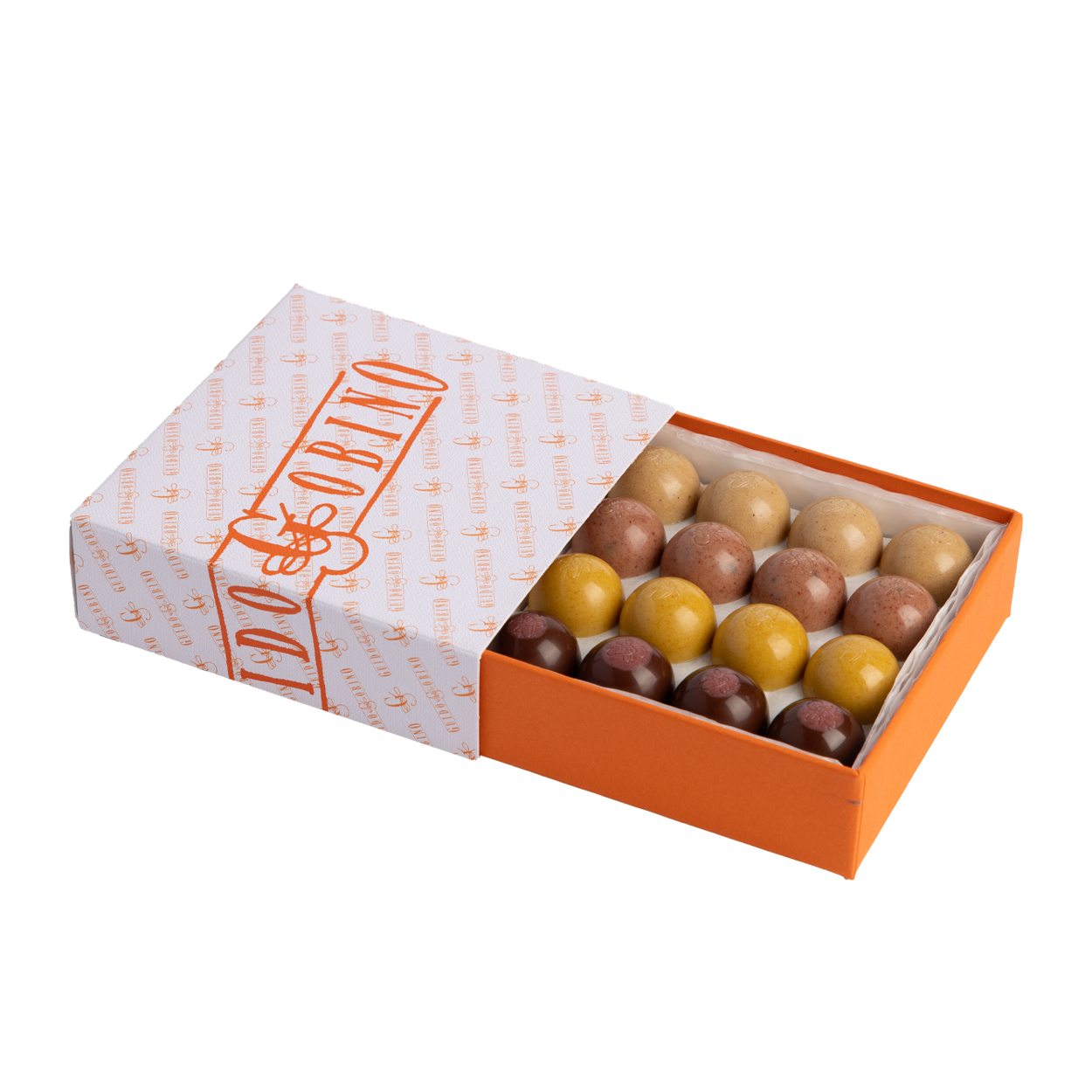 A delightful box containing four new semi-sphere recipes: Peach filled with Cocoa Cream, Mango, Dark Chocolate with Raspberry and Strawberry and Cocoa Nibs.
