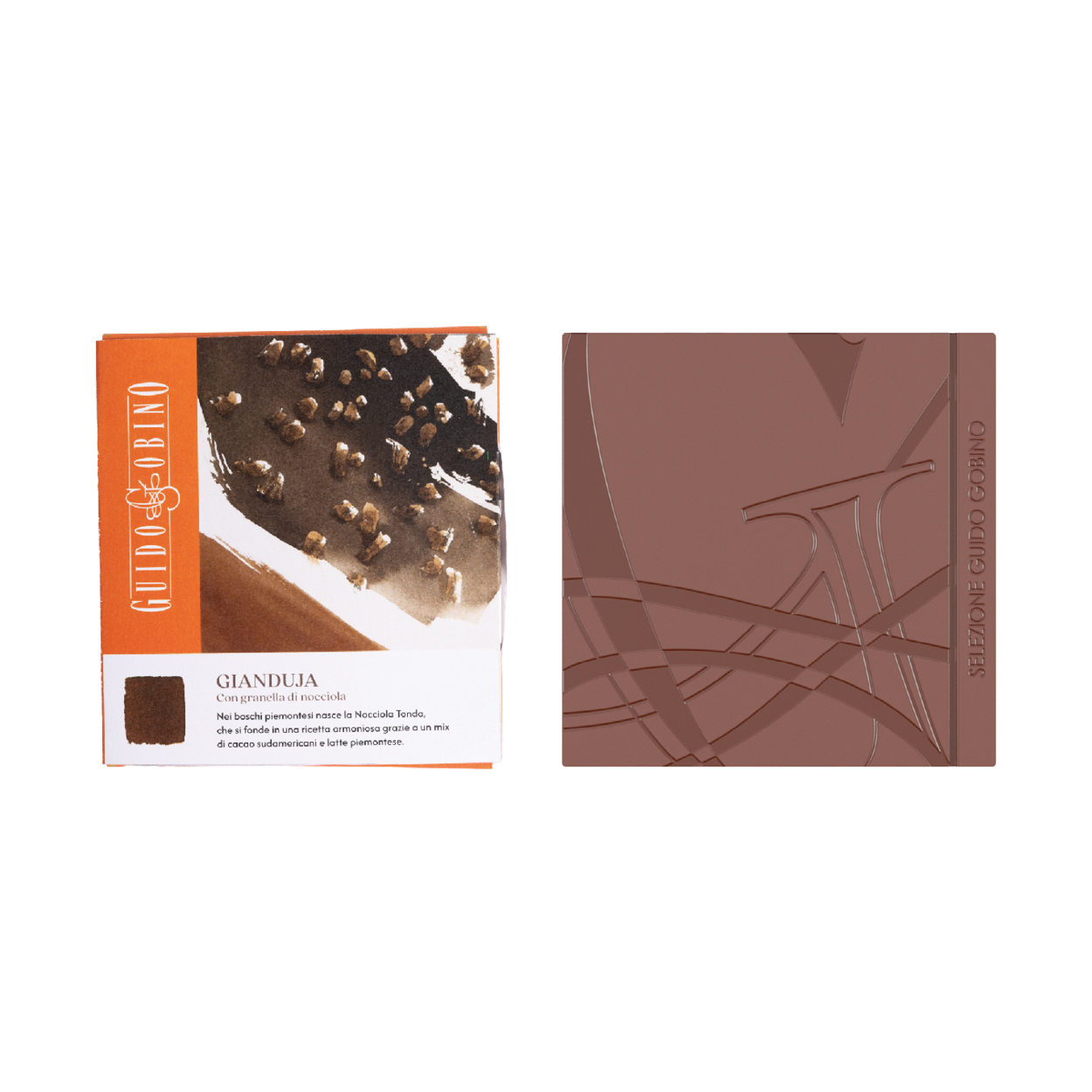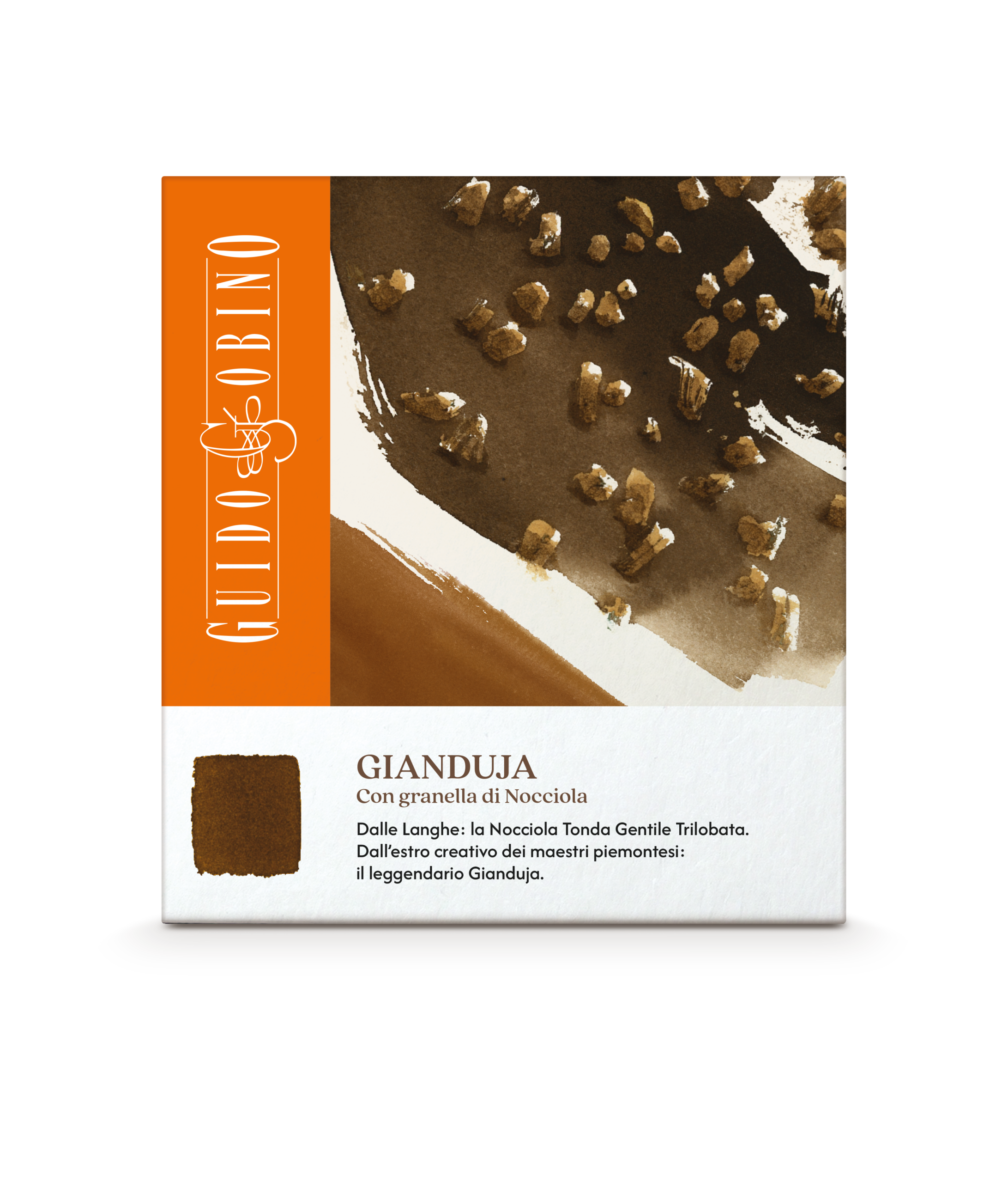 A new recipe that enhances our classic Gianduja chocolate, made with Tonda Gentile Trilobata hazelnuts, aromatic cocoa from South America, and Piedmontese milk. The mixture is enriched with crunchy hazelnut pieces, which add intensity and texture.