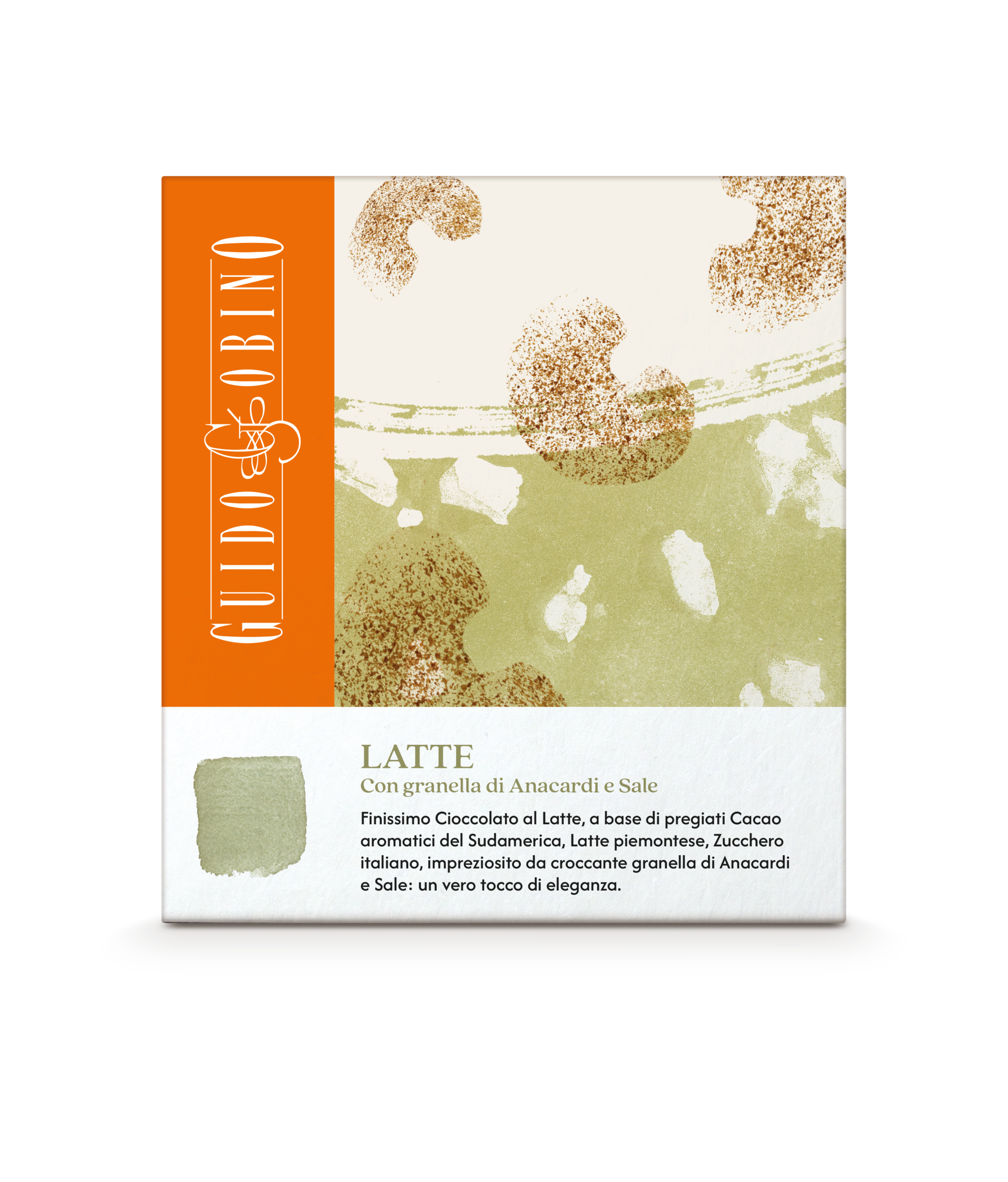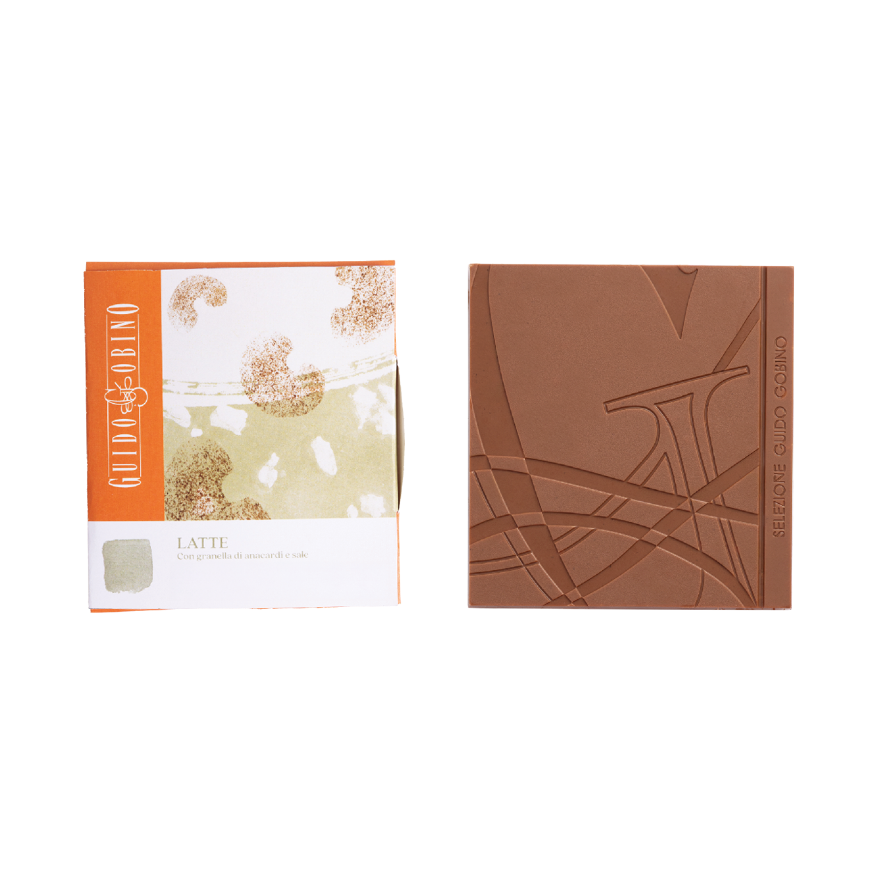 Finissimo Milk Chocolate, made with fine aromatic cocoa from South America, Piedmontese milk, Italian sugar, enriched with crunchy cashew nuts and salt: a true touch of elegance.