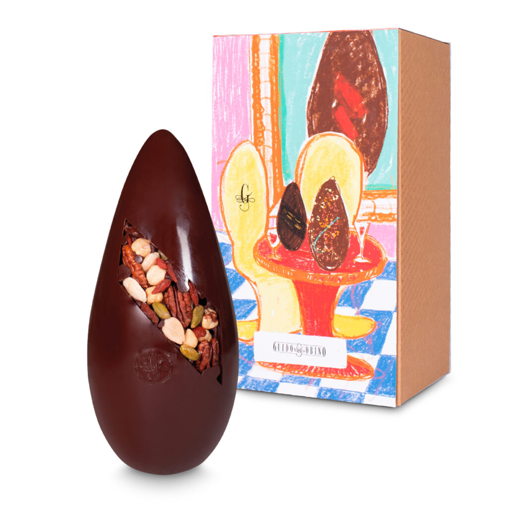 Un uovo realizzato con Cioccolato fondente 63% che lascia intravedere al suo interno una selezione di frutta secca tra cui Pistacchi, bacche di Goji, noci Pecan, Nocciole e Mandorle.