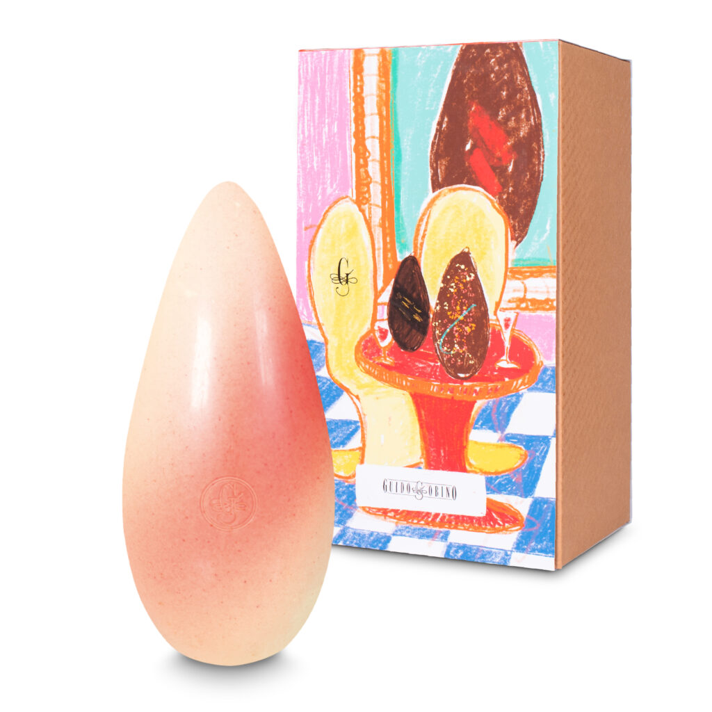 Un elegante uovo decorato a mano con schizzi color pastello realizzati a base di cioccolato Bianco disponibile nella versione al Latte o fondente 63%. Le uova contengono le sorprese artigianali della cooperativa ESSERCI