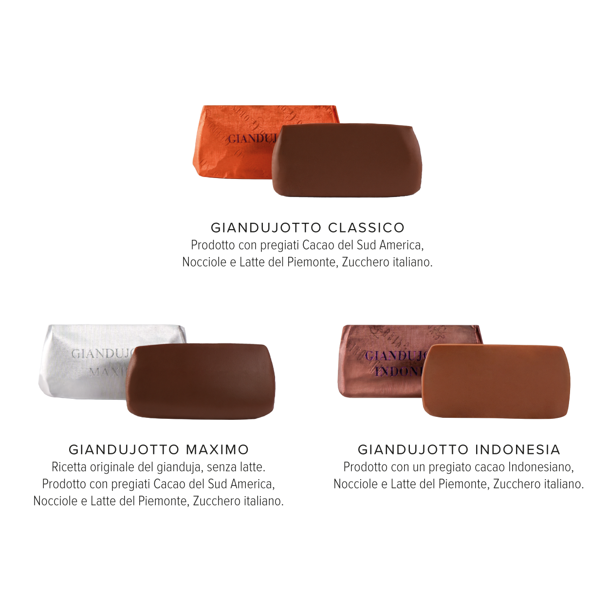 I nostri Giandujotti sono prodotti con selezionati Cacao, la Nocciola Tonda Gentile Trilobata del Piemonte, lo Zucchero da barbabietola della filiera agricola italiana. Realizzati con il metodo tradizionale dell’estrusione che dona al Giandujotto la sua forma unica. In questo assortimento è presente il Giandujotto Indonesia, vincitore del premio Tavoletta d’oro nel 2023 come miglior ricetta di Gianduja.