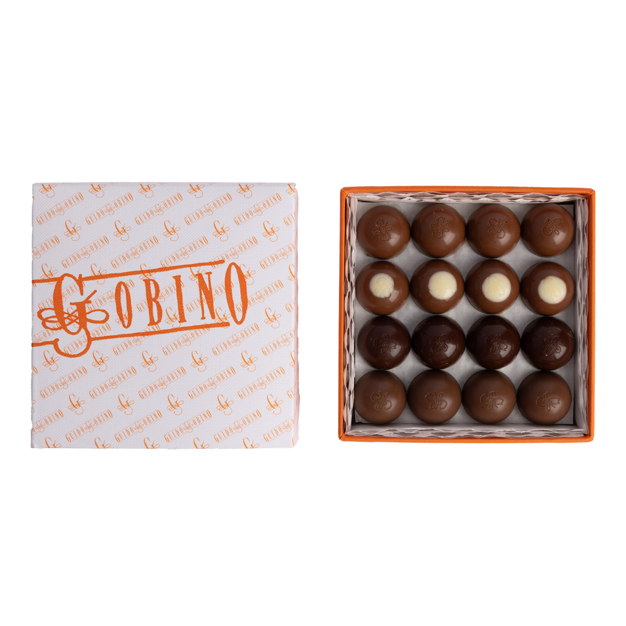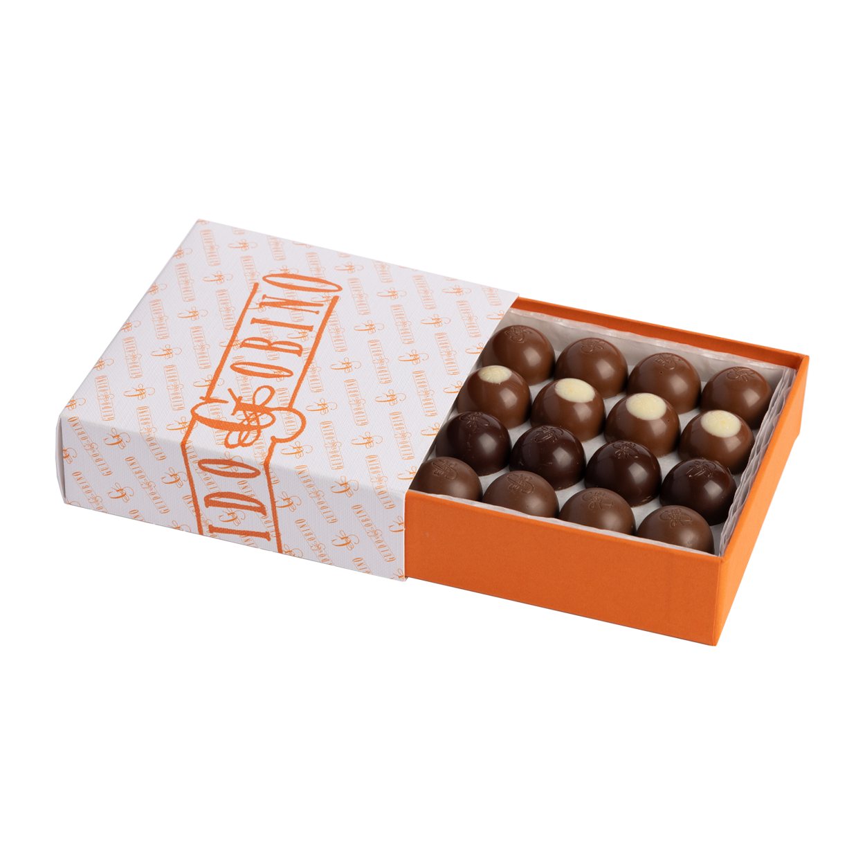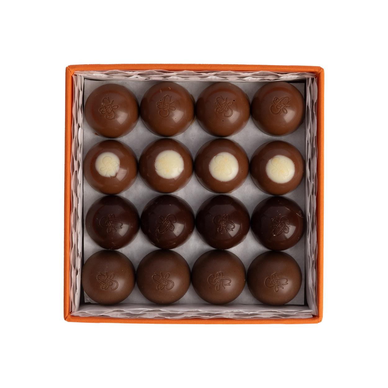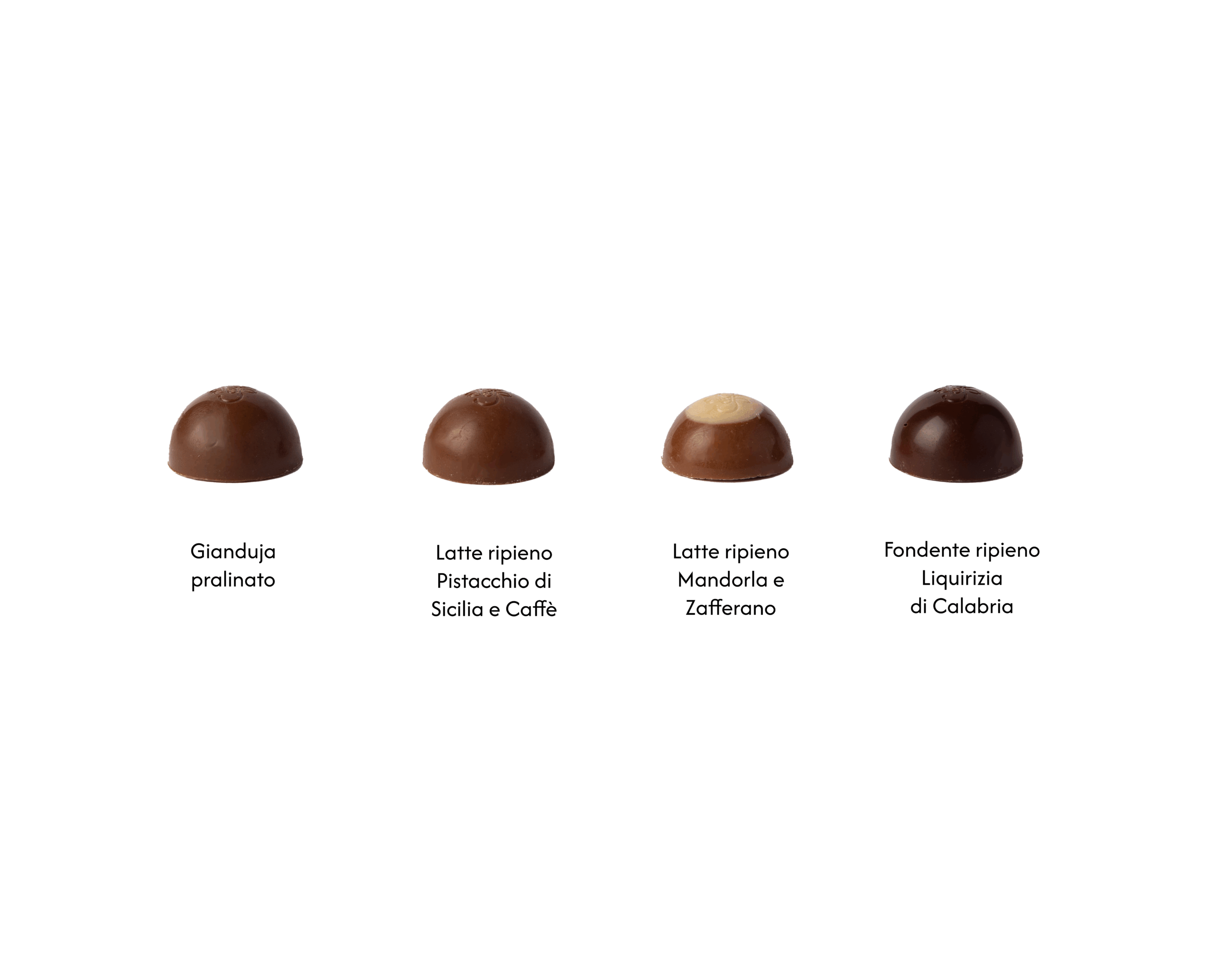 Una deliziosa scatolina che racchiude le quattro nuove ricette delle semisfere: Fondente ripieno di Liquirizia di Calabria, Gianduja pralinato, Latte ripieno Pistacchio di Sicilia e Caffè e Latte ripieno Mandorla e Zafferano.