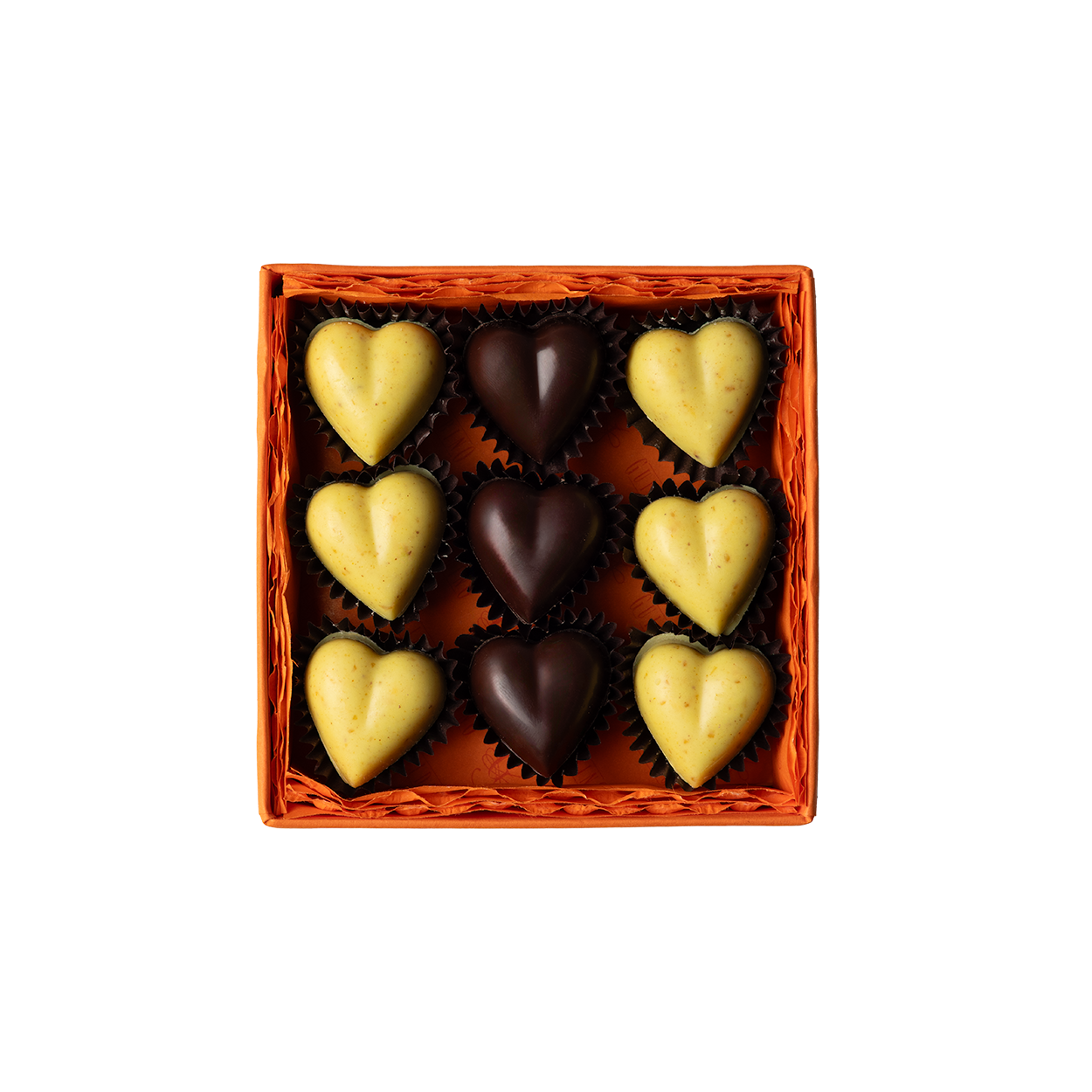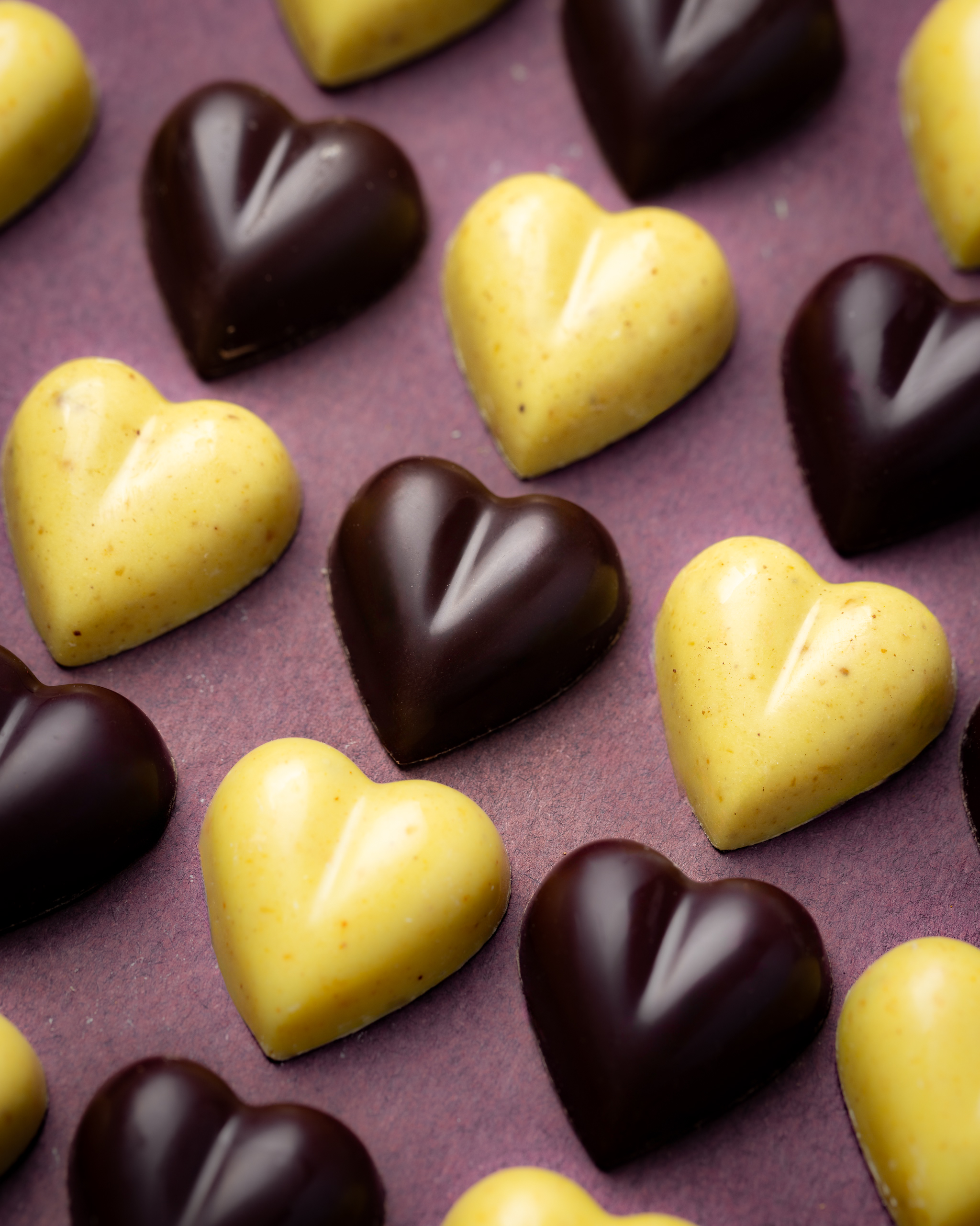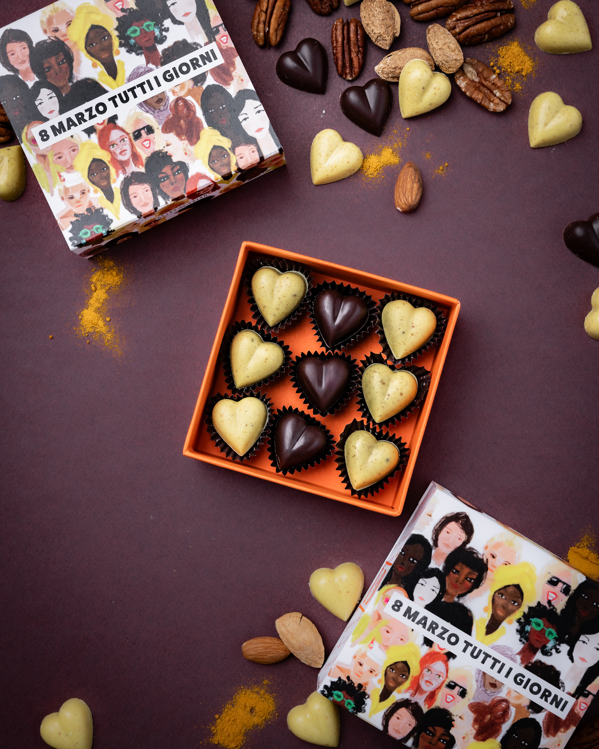 - Cuoricini Cioccolato Bianco pralinato e Curcuma: un sapore dolce, avvolgente e vellutato. Le Noci Pecan e le Mandorle creano con il Cioccolato Bianco un irresistibile contrasto.