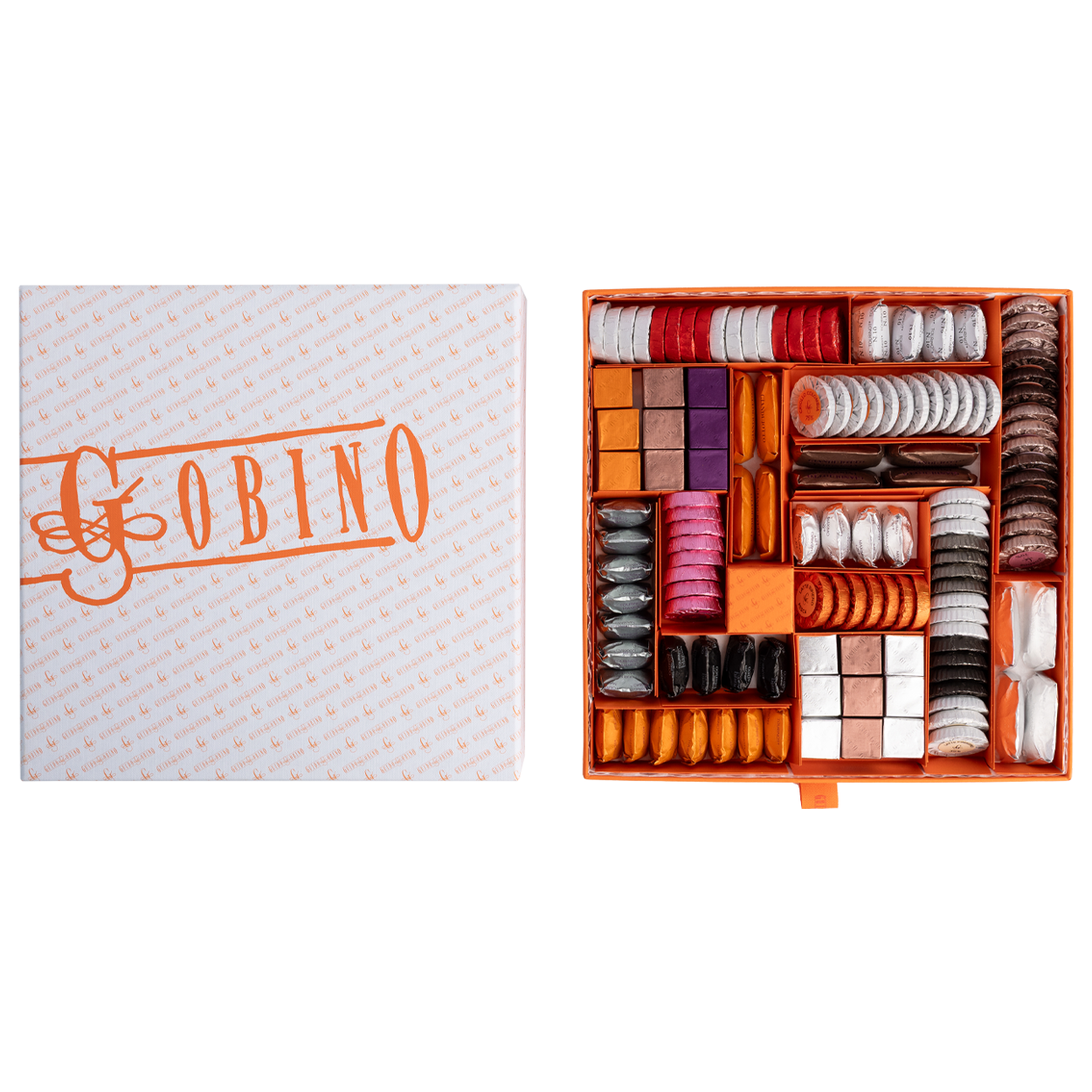 Ingredienti: zucchero, massa di cacao, burro di cacao, LATTE intero in polvere, NOCCIOLA Piemonte IGP, MANDORLA di Sicilia, PISTACCHIO di Sicilia, burro concentrato (LATTE), frutti di bosco disidratati in polvere (mirtillo, lampone, mora), pesca disidratata in polvere, cacao in polvere, cacao magro in polvere, caramello (zucchero), olio extravergine di oliva, sale marino integrale, scorza di arancia e limone, caffè in polvere, emulsionante: lecitina di SOIA, estratto naturale di vaniglia. “Senza glutine”. Conservare in luogo fresco a 18-20 °C.